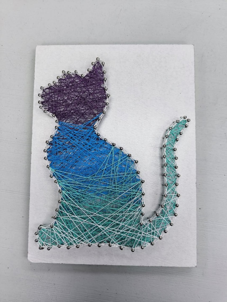 每一口釘都有 自己安放的位置, 一下一 鎚的把釘子固定在板上, 再用不同顏色的線綫出可愛漸變的花貓, 整個過程有很多重複的動作,要非常專注及靜心, 雖然揼鎚仔有點嘈吵, 但我們也可以練習「噪音靜心」, 在嘈雜的環境中仍能專注當下每一刻。
